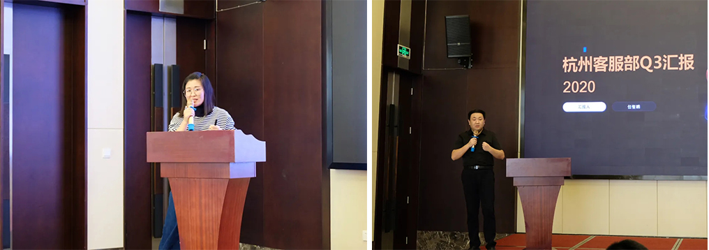 接下來,南京首屏副總經(jīng)理高娜、杭州客服部總監(jiān)任智鵬分別針對(duì)南京、杭州客服業(yè)務(wù)開展工作匯報(bào),深度剖析Q3工作成果、分析總結(jié)存在的問題和難點(diǎn),并對(duì)Q4的工作重心進(jìn)行詳細(xì)規(guī)劃。