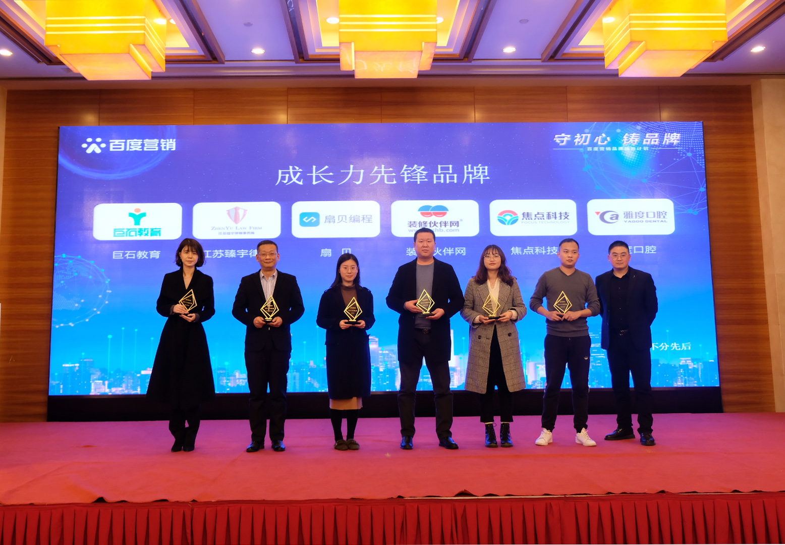 南京是一座歷史文化名城,同時(shí)也是一座創(chuàng)新名城,在創(chuàng)新的路上匯聚了眾多品牌力量。在發(fā)布會(huì)上,根據(jù)數(shù)據(jù)趨勢(shì)、百度搜索熱度排名等數(shù)據(jù),首屏百度營(yíng)銷(xiāo)(南京)服務(wù)中心分別為巨石教育、焦點(diǎn)科技、扇貝、裝修伙伴網(wǎng)、江蘇臻宇律所、雅度口腔6家企業(yè),頒發(fā)“成長(zhǎng)力先鋒品牌”榮譽(yù)獎(jiǎng)項(xiàng),以鼓勵(lì)品牌企業(yè)長(zhǎng)遠(yuǎn)發(fā)展。