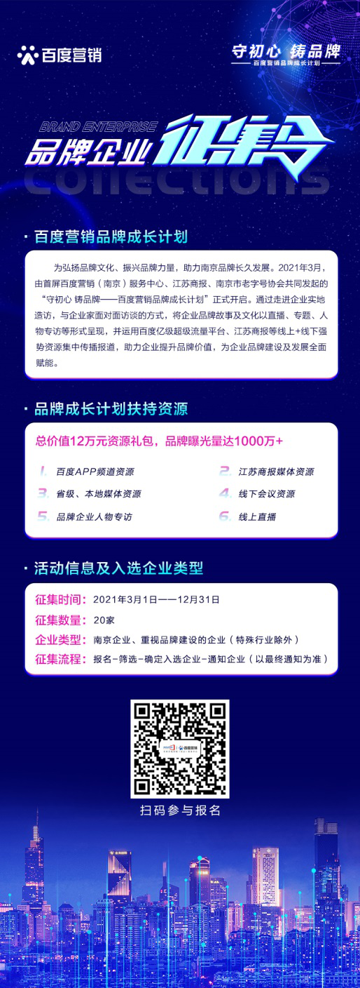 作為百度營(yíng)銷(xiāo)大型品牌IP,“百度營(yíng)銷(xiāo)品牌成長(zhǎng)計(jì)劃”深度聚焦南京品牌企業(yè)、挖掘品牌故事,借助百度億級(jí)超級(jí)流量平臺(tái)資源、百度 AI技術(shù)、大數(shù)據(jù)能力以及全鏈?zhǔn)綘I(yíng)銷(xiāo)能力,以直播、視頻、專(zhuān)題、人物專(zhuān)訪(fǎng)等形式,為南京品牌企業(yè)提供多維度品牌價(jià)值提升與增值。
